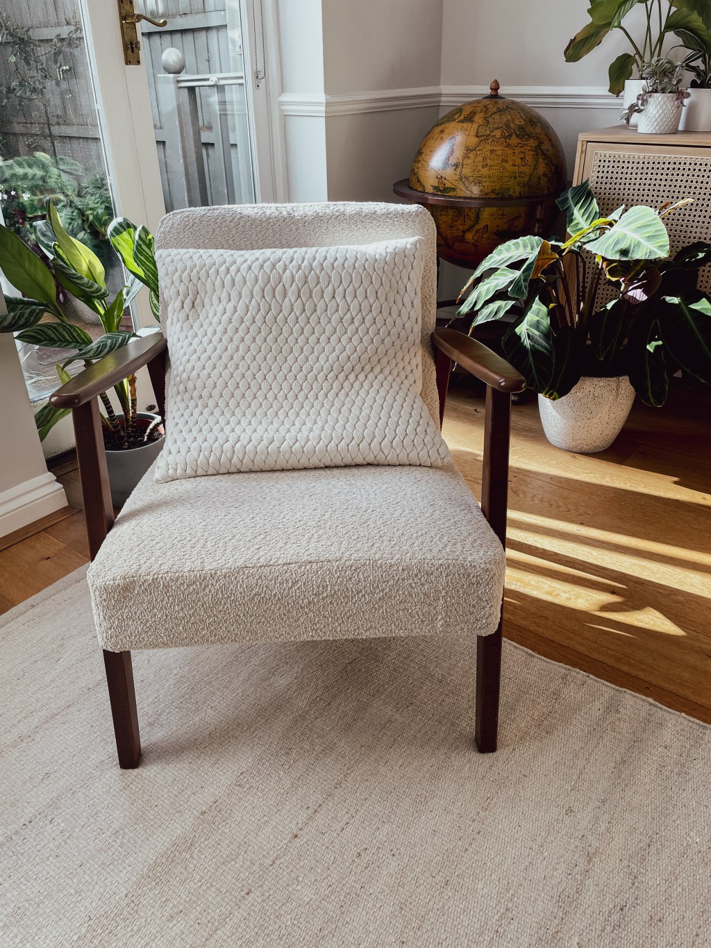 Speaking of refurbishing, this photo is of my upholstered IKEA chair. The grey color didn’t match the rest of my space after moving house, but I loved the shape and style, so I decided to refurbish it myself. I have to say, I am really happy with the result, and I think the textured finish adds a nice touch.