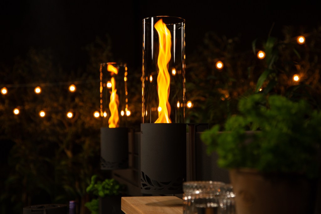 Its sleek, cylindrical glass form generates a natural air flow that swirls around the flame, creating a striking spiral effect in motion.
