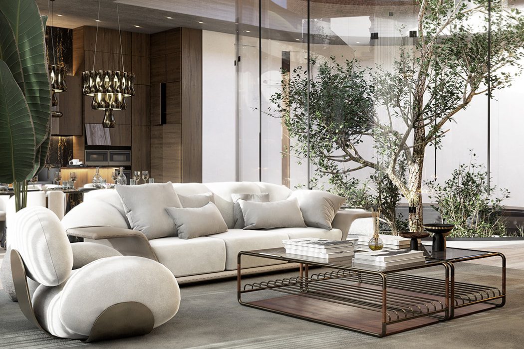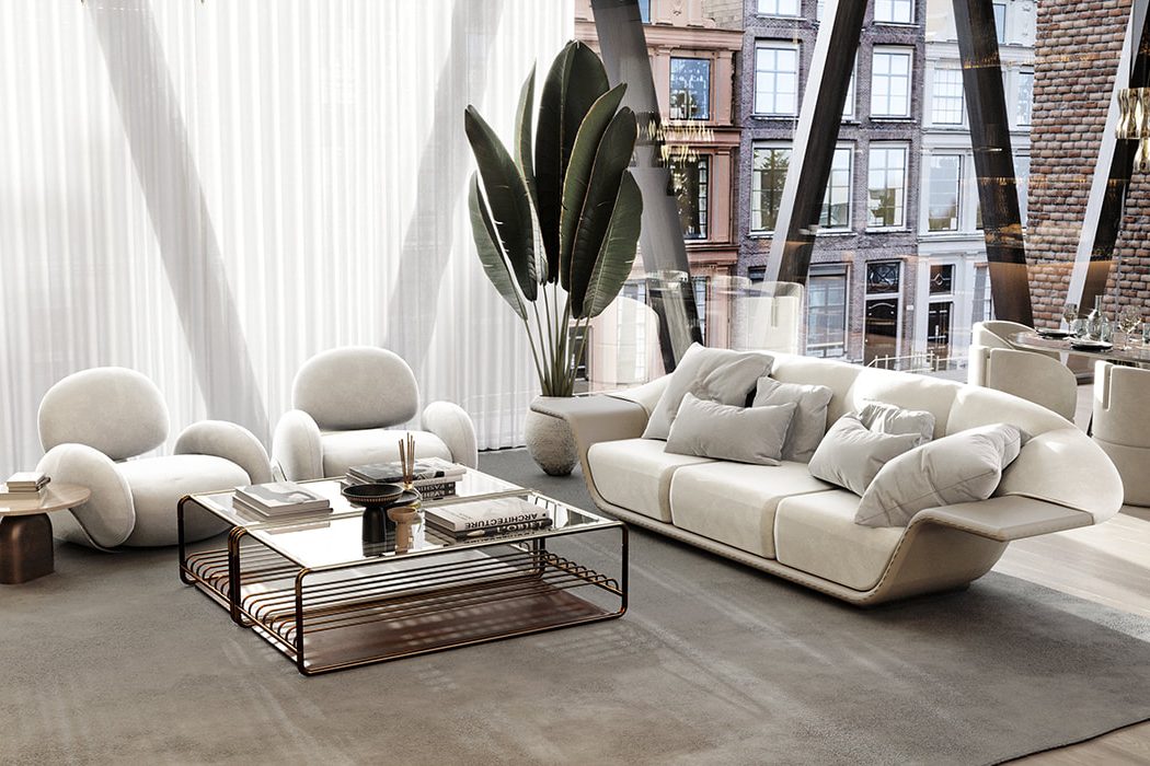 he Klaude Sofa features elegant, sloping sides that invite relaxation and add a sculptural touch to any space. With its modern silhouette and generous proportions, it offers both comfort and visual appeal. Upholstered in high-quality fabrics, this sofa seamlessly blends style and functionality, making it a versatile addition to contemporary interiors.